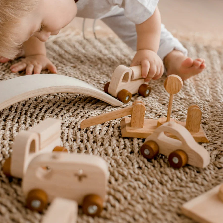 This stunning wooden set includes 7 different vehicles, a bumpgate, traffic signs, bridge, and storage box that can double as a gargage. Cars and trucks are beautiful toys for storytelling and imaginative play.